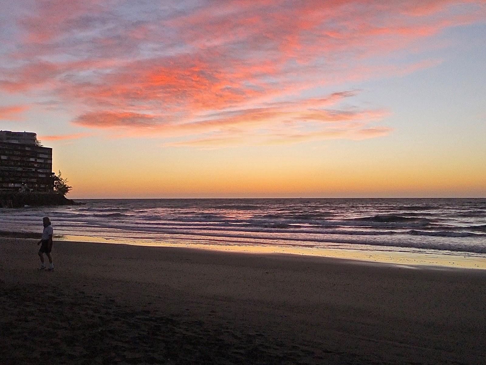 Tässä alkaa se mitä tuolla ingressissä jo lupasin: tammikuun calimakausi. Se on vielä sen verran ohutta, että aurinko kajastaa sen lävitse. Kylmäkin oli, mutta tämä sitkeä sissi seurasi hellittämättä auringonnousua.