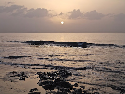 Aurinko nousee keltaisena. Se on caliman merkki, vaikka nyt sitä on niin vähän ettei huomaa ellei tiedä.