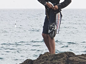 Iltapäivällä näen, että kun kala Kanarialla syö, niin se syö oikein olan takaa. Beach Clubin niemen kärjessä kaveri veti puolen tunnin sisään parikolmekymmentä kalaa, yhden joka toisella heitolla. Jopa kaksi kalaa kerralla! Toinen kaveri vieressä ei saanut mitään.